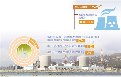 “到2020年,我國(guó)核電運(yùn)行和在建裝機(jī)將達(dá)到8800萬(wàn)千瓦。”國(guó)家原子能機(jī)構(gòu)副主任、國(guó)防科工局副局長(zhǎng)王毅韌表示,發(fā)展新能源是實(shí)現(xiàn)未來(lái)可持續(xù)發(fā)展的必然趨勢(shì),核電作為低碳能源,是新能源的重要組成部分,是我國(guó)未來(lái)能源可持續(xù)發(fā)展的重要基礎(chǔ)。據(jù)經(jīng)濟(jì)合作與發(fā)展組織和國(guó)際能源署聯(lián)合預(yù)測(cè),到2050年,全球核電發(fā)電量將在現(xiàn)有基礎(chǔ)上翻番,發(fā)電比例將達(dá)世界發(fā)電總量的17%。但目前我國(guó)核電在發(fā)電總量中的比重還較低,僅占3%左右,遠(yuǎn)低于全球11%的平均水平。因此,要在確保安全的前提下,高效發(fā)展核電。